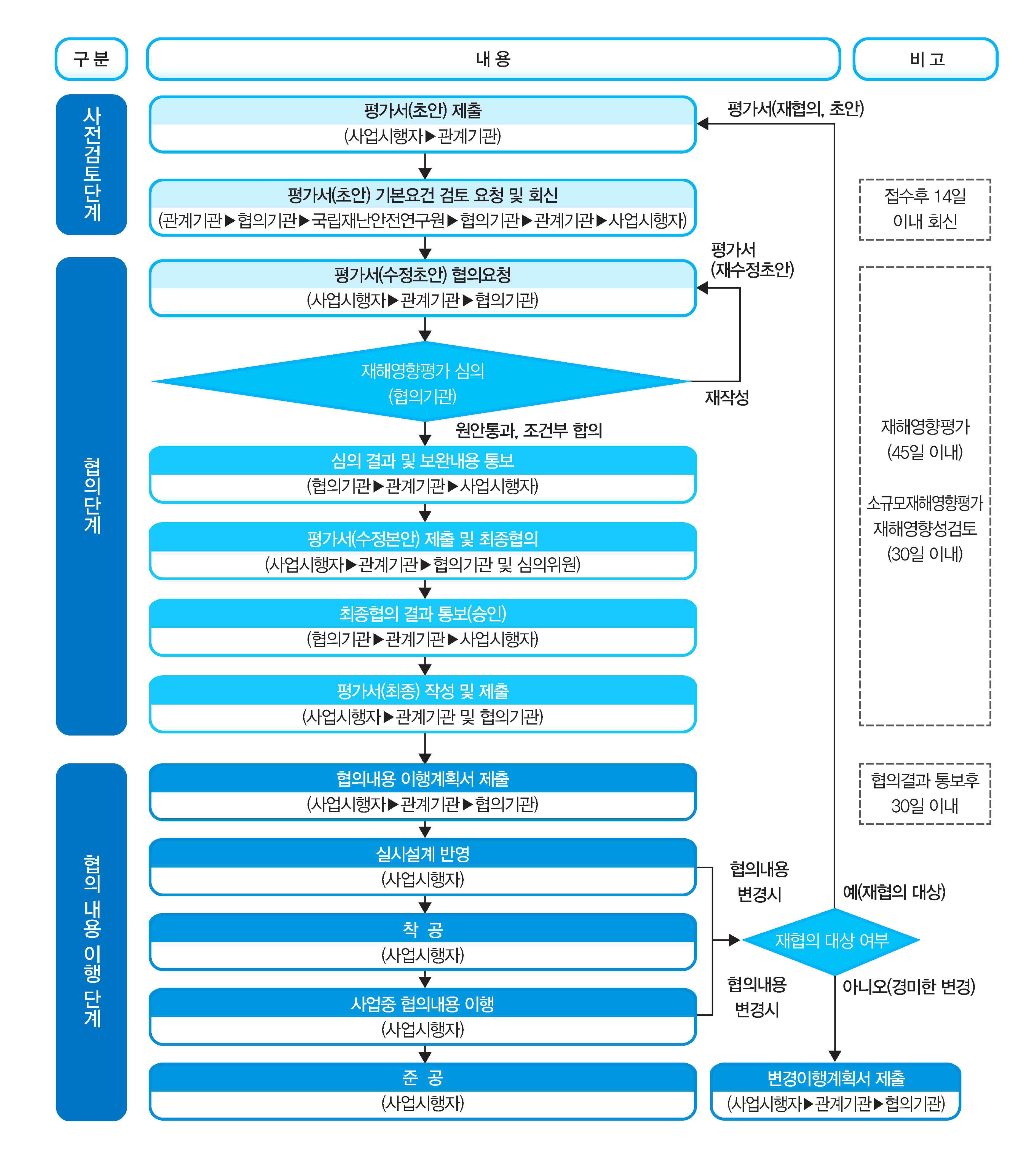 | 재해영향성검토 | 「재해영향성검토」는 자연재해에 영향을 미치는 행정계획으로 인한 재해 유발요인을 예측·분석하고 이에 대한 대책을 마련하는 것이다. |