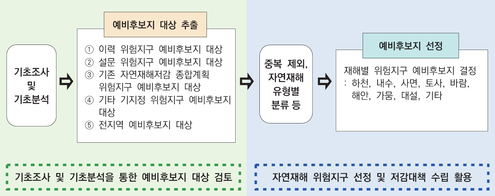 - 전지역 예비후보지 대상은 자연재해 유형별 자연재해 발생 가능성 검토 내용을 토대로 자연재해 발생 가능성이 높은 지역을 대상으로 추출한다.