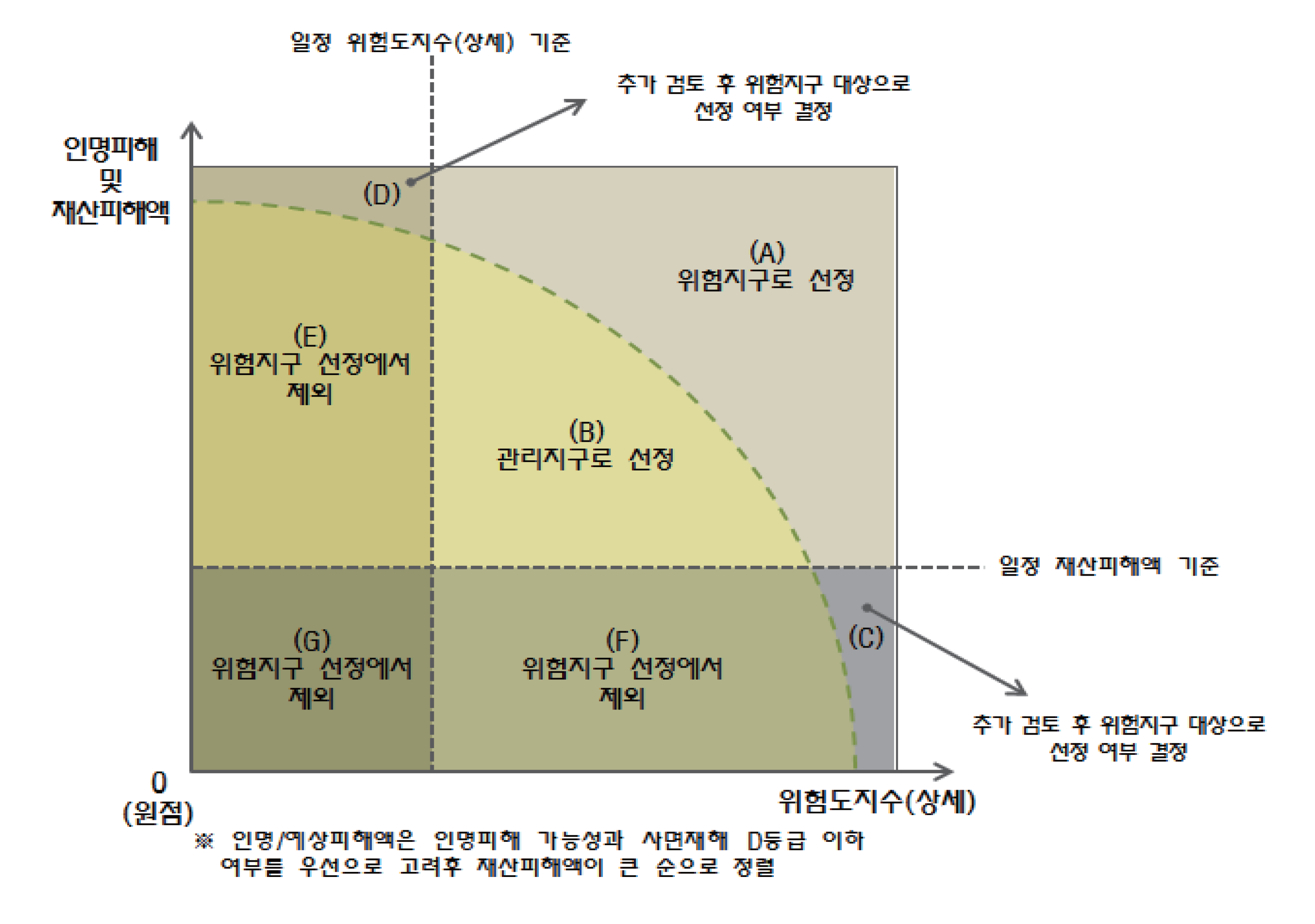 - 위험지구 대상의 추가 선정을 위하여 1차적으로 재산피해액이 낮은 위험지구 후보지를 제외하는데, (C), (F), (G) 영역이 이에 해당한다. 이때 사용되는 재산피해액 기준은 지역의 현황에 맞도록 공학적 판단을 통해 결정되어야 할 사항이나 위험지구로서의 기본요건인 '국비나 지방비의 지원이 필요할 정도의 일정 규모의 사업비' 이상으로 그 기준을 설정한다.