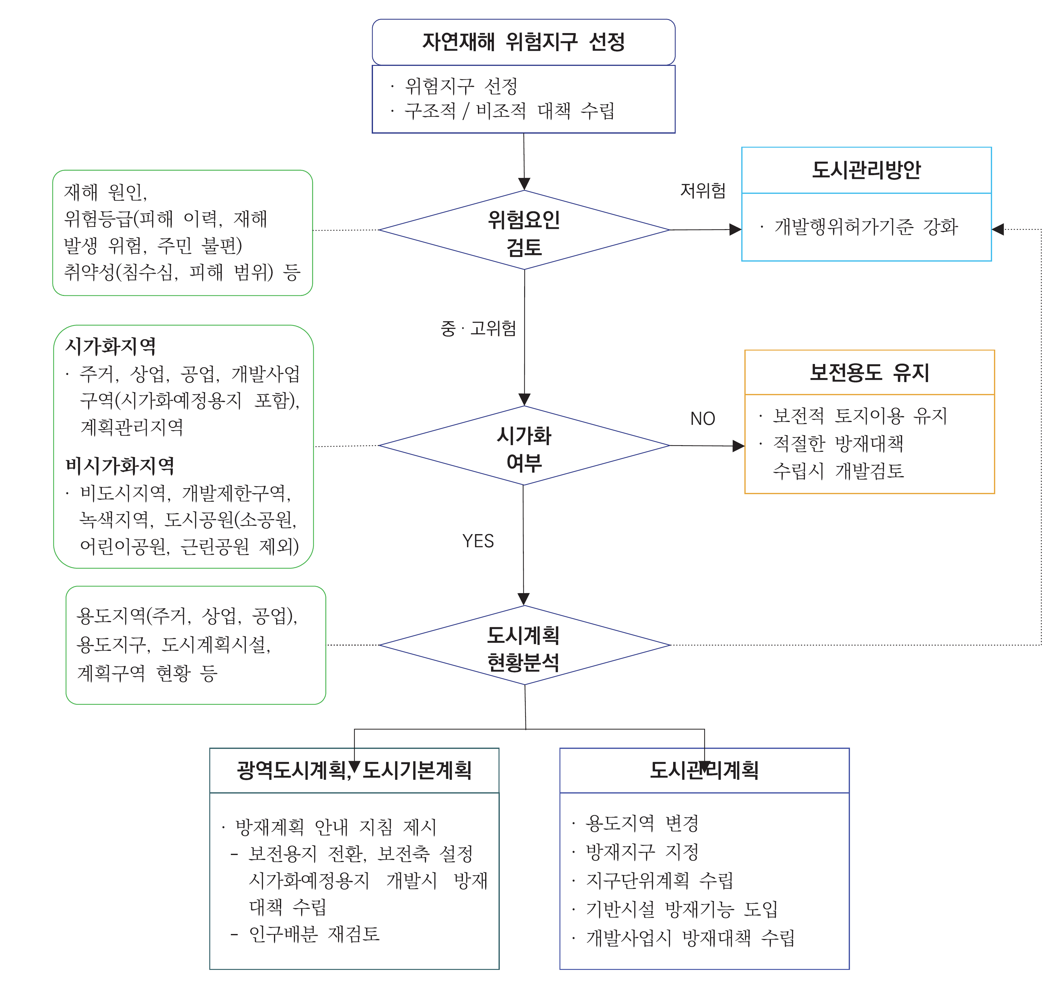 • 도시계획은 도시·군기본계획이나 도시·군관리계획의 입안 및 결정 시 자연재해저감 종합계획의 내용이 반영될 수 있도록 아래와 같이 자연재해 위험지구의 위험요인 검토(저, 중·고위험), 시가화 여부(시가화지역, 비시가화지역), 도시계획 현황분석(용도지역, 용도지구, 도시계획시설, 계획구역 현황 등) 등의 순서로 검토하여 비시가화지역은 현재의 보전 용도를 유지하고 시가화지역은 위험지구에 대한 위험요인(예상 피해 규모, 침수심 등), 위험도(피해 우려 취약시설 및 안전취약계층 현황), 토지이용계획(용도지역, 용도지구, 각종 도시개발사업 계획 등), 자연재해 저감대책 등을 구체적으로 제시하여 도시계획 수립 시 활용할 수 있도록 연계 내용을 제시하여야 한다.