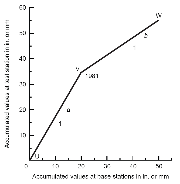 주변 관측소의 평균이 누적값과 플롯에 사용됩니다. 데이터가 일관되면 플롯은 직선이 됩니다. 반면에 일관되지 않은 데이터는 불일치가 발생한 지점에서 기울기 변화 또는 끊김 현상이 나타납니다. 위의 그림에서 UV의 선의 기울기가 a이고 VW선의 기울기가 b인 경우, 두 선분의 기울기 비율에 따라 일관되지 않은 데이터를 조정합니다. 두 가지 방법으로 조정할 수 있습니다.