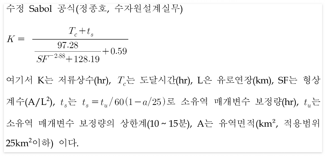 - 저류상수 공식은 Russel 공식과 Sabol 공식 등이 주로 사용되어 왔다. Russel 공식은 유역규모 및 유역형상을 고려하지 못하며, Sabol 공식은 유역형상을 형상계수의 역수 형태로 고려하므로 주로 사용되었다.