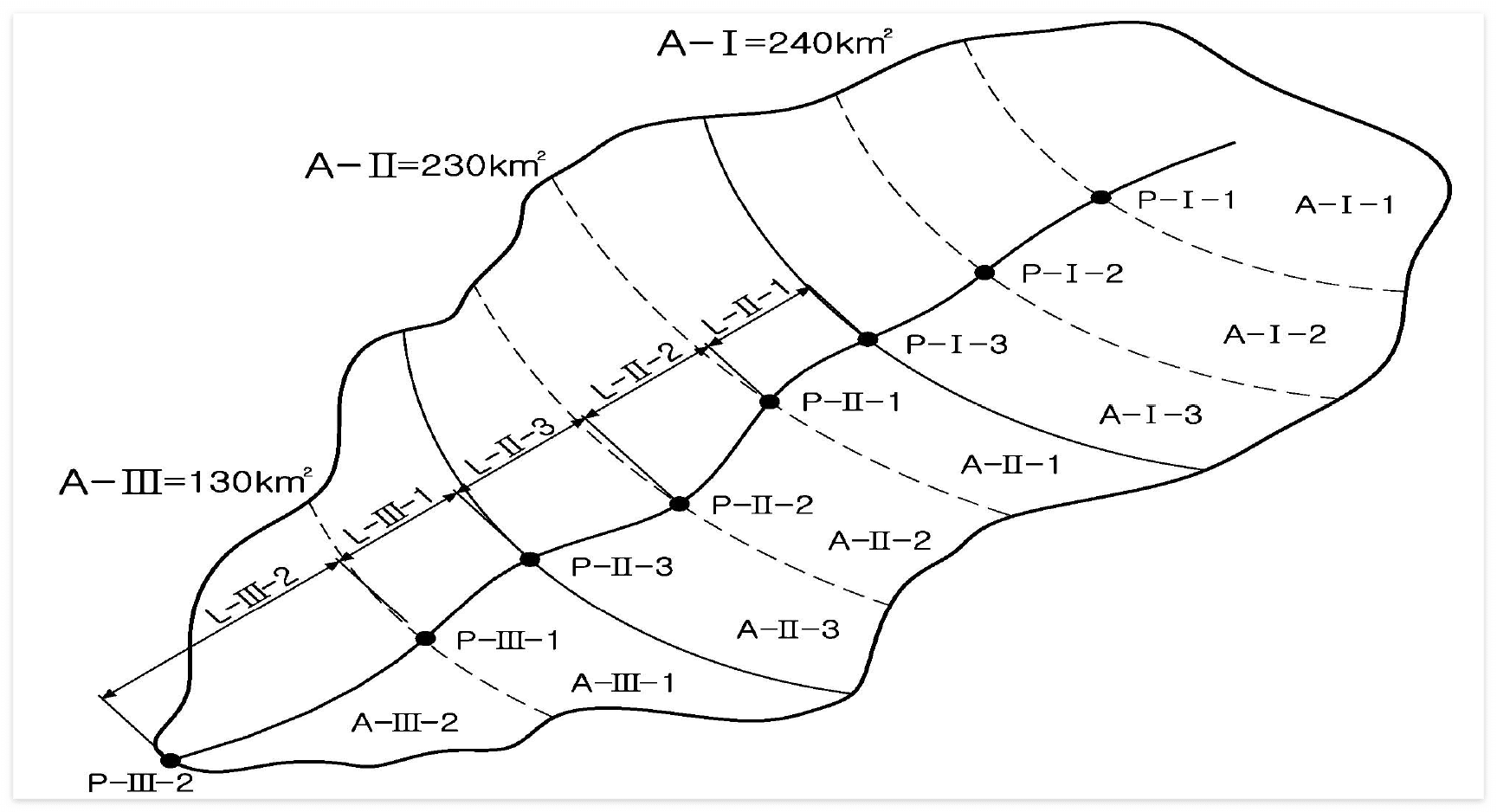 1. 분석 대상유역의 홍수량 산정지점(P-I-1, P-I-2,......, P-III-2 등) 기준으로 여러 개의 소유역(A-I-1, A-I-2,......, A-III-2 등) 으로 분할하기 이전에 전체 대상 유역을 상류로부터 하류 방향으로 유역면적이 약 250㎢ 이하인 몇 개의 중규모 유역(A-I, A-II, A-III 등) 으로 분할하고 최상류 중규모 유역의 홍수량을 유역추적 방법으로 산정한 후, 이를 직하류 구간에 대한 하도추적 대상 홍수량으로 채택한다.