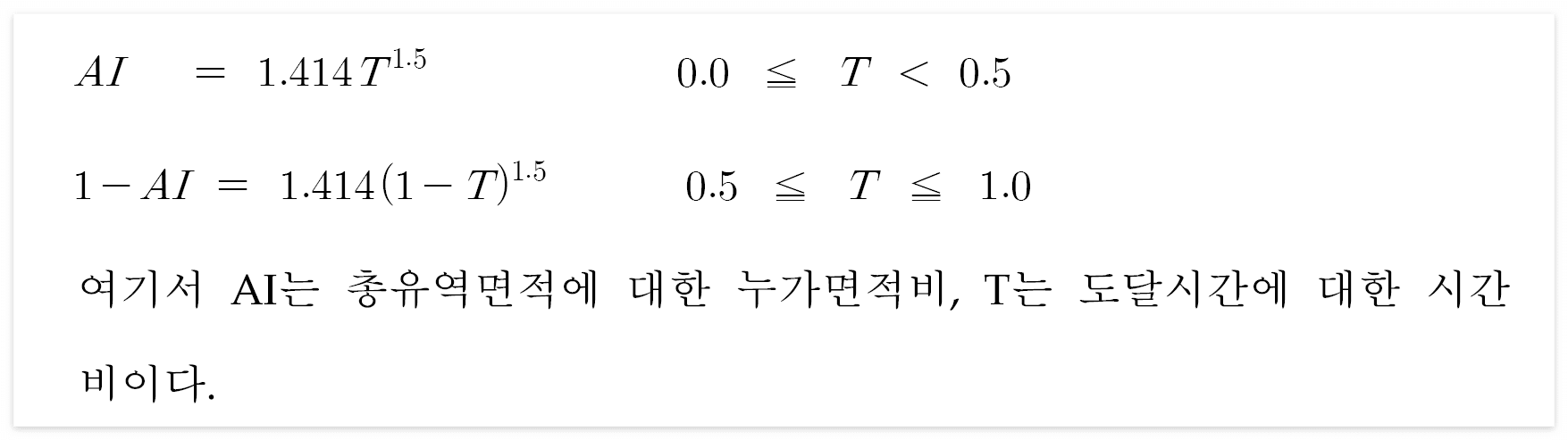 - 합성 시간-면적곡선 방법에서는 시간-면적곡선을 일반적인 타원형 유역 형상에서 유도된 다음과 같은 식으로 표시되는 합성 시간-면적곡선의 형태로 표시한다.