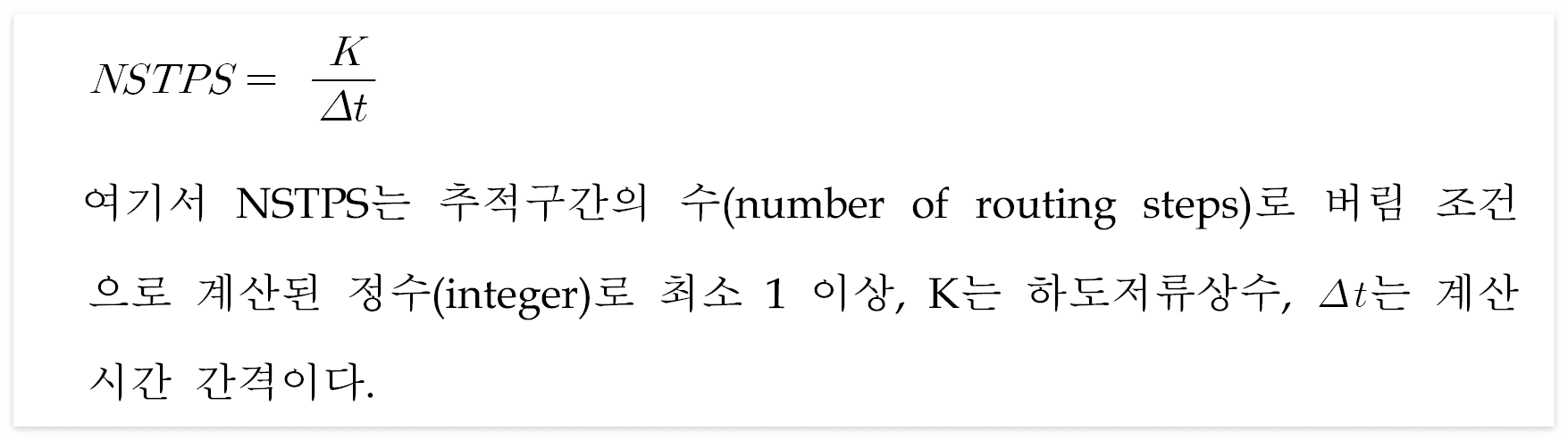 • 홍수추적 구간이 길어서 K값이 상대적으로 커서 2Kx < △t 조건을 만족시키기 어려운 경우 전체 추적구간을 소구간으로 나누어야 한다. 이 때 각 소구간 홍수파 통과시간을 홍수추적의 시간간격과 같은 것으로 가정하기 위하여 다음과 같이 추적구간 수를 결정하여야 하며, 저류효과는 추적구간 수가 많아질수록 적어진다.