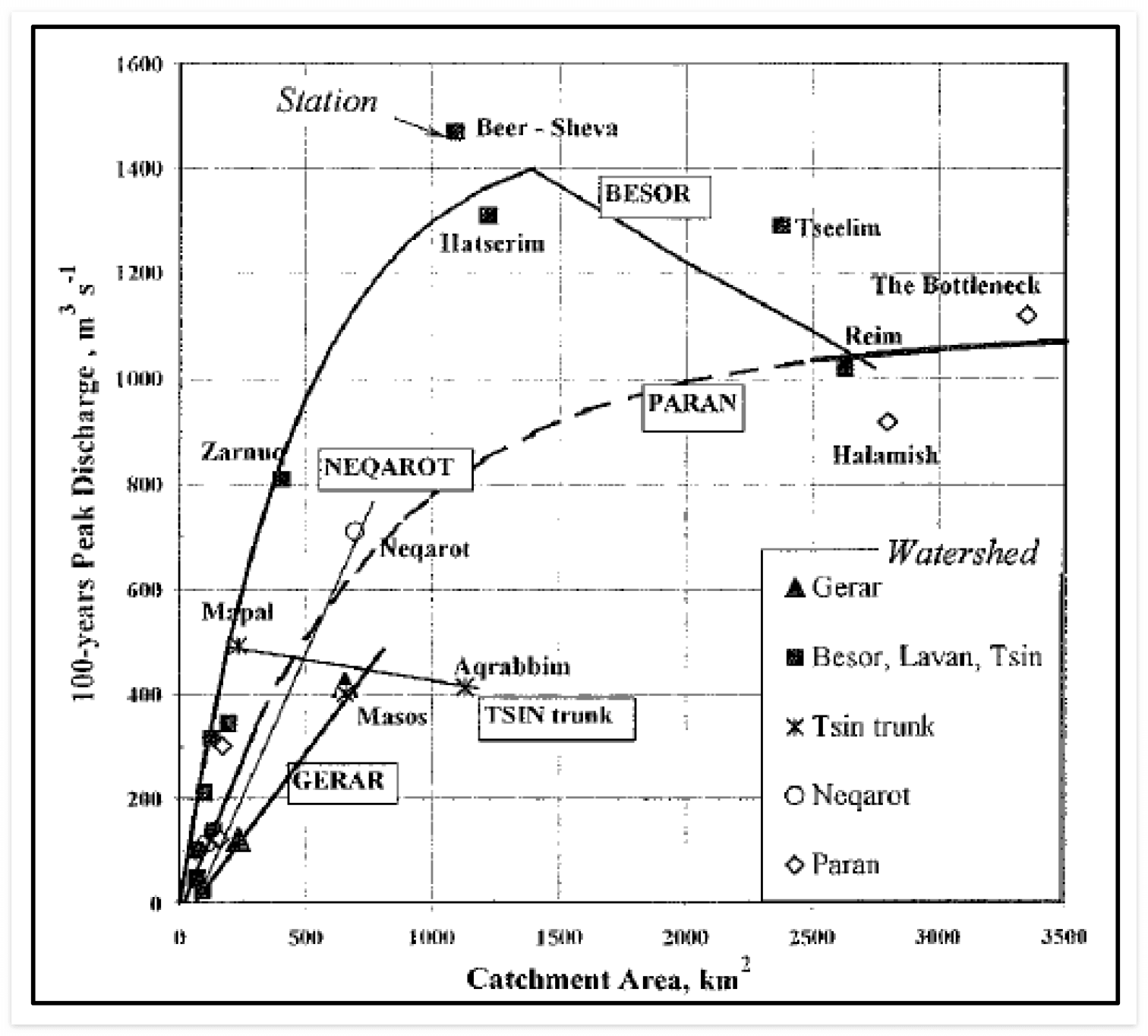 - 대규모 유역의 경우 단위도의 기본 가정을 벗어나는 강우-유출관계가 예상되므로, 전체 유역을 적정한 개수의 유역과 하도구간으로 나누어 단위도의 적용과 하도추적을 병행하여 수문곡선을 합성해 나가는 것이 타당한 방법이다. 「Water in Environmental planning (Dunne and Leopold, 1978)」에서는 단위도는 100mi2(약 250㎢) 이하에서 적용이 적합하다고 하였으며, 「Hydrology of Floods in Canada : A Guide to Planning and Design(NRCC, 1989)」에서는 소·중·대 유역규모에 따른 유출특성을 유역면적 25 ~ 250㎢를 기준으로 제시하였다. 「Frequency and magnitude of runoff events in the arid Negev of Israel(Meirovich et al., 1998)」과 「Runoff events in the Negev, Israel (Ben-Zvi and Shentsis)」의 연구결과, 유역면적이 약 250㎢ 이하에서 첨두유출량은 유역면적에 비례한다고 하였다. 면적이 큰 유역에서 유역면적이 비례하여 첨두유출량이 증가하지 않는 것은 유역면적이 클수록 하도추적(flood routing)과 이동손실(transmission losses)의 영향이 크다는 증거라고 하였다. 또한 「Engineering hydrology, principles and practices, Second Edition (Ponce, 2014)」에서는 250㎢ 이하에서 단위도의 사용을 추천하였고, 250㎢ 이상에서 사용을 배제할 수는 없으나, 유역 크기가 증가함에 따라 정확도가 감소한다고 하였다.