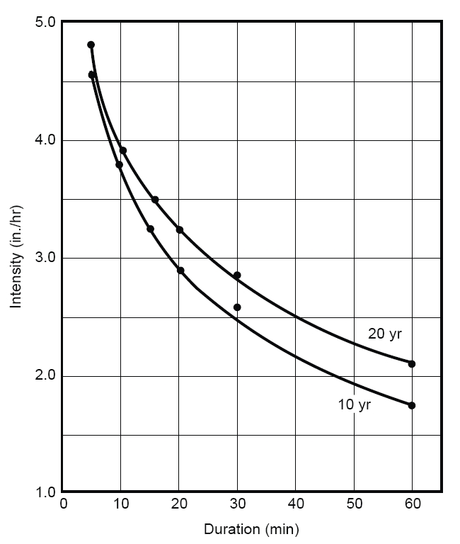 4. 계산된 각 재현기간에 대해 강우량이 다른 지속기간의 그래프로 표시됩니다. 강우 깊이는 강으강도로 변환할 수 있습니다. 이러한 값은 산술그래프 또는 로그(대수) 용지에 강우강도-지속기간-빈도(IDF)곡선으로 표시됩니다.