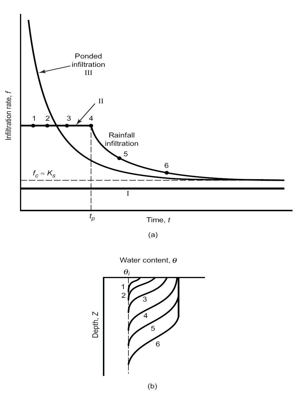 초과강우에 대한 정보는 수문분석에 필요합니다. 즉각적인 하천 흐름에 기여하는 직접 유출 또는 초과 강우는 단기 증발산이 없거나 증발산을 위해 조정된 경우 강우에서 침투량을 제외하고 평가합니다. 초기 수분 함량이 균일한 균질 토양 기둥이라는 간단한 모델을 고려합니다. 침투에는 세 가지의 경우가 있습니다.
