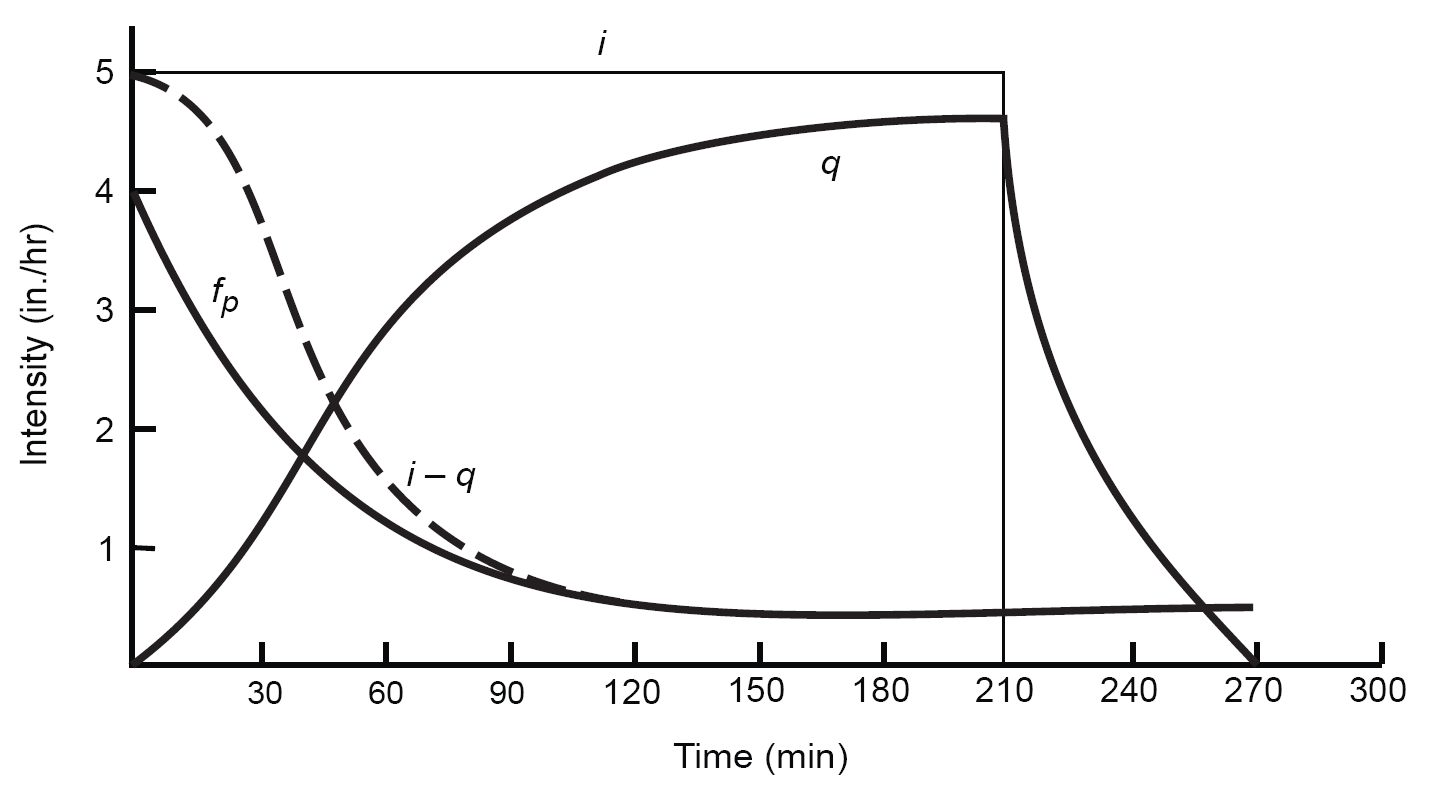 강우강도 i의 비가 지속적으로 균일하게 내릴 경우 표면 유출수의 수문곡선은 q로 표시된 모양을 갖습니다. 강우량와 유출량의 차이는 (i - q)로 표시된 곡선으로 나타납니다. 곡선 fp는 침투율과 관련이 있습니다. 점선으로 표시된 (i - q)곡선과 fp곡선의 차이는 초기의 차단 및 기타 사소한 손실(지면 저류 등)을 나타냅니다. 지표면 저장량이 채워진 후에는 두 곡선이 일치합니다(즉, 강우량에서 침투를 뺀 직접 유출이 발생함). 사소한 손실은 저류 후 강우량에서 제외됩니다. 일반적으로 이러한 손실은 상대적으로 경미하고 신뢰성 있게 평가할 수 없기 때문에 무시됩니다. 따라서 기본적인 문제는 다양한 조건에서 침투 손실률을 결정하는 것과 관련이 있습니다. 이를 지표 유출 평가에 대한 침투 접근법이라고 하며, 직접 강우-유출 상관관계 및 다변량 우츨 관계와 비교됩니다.