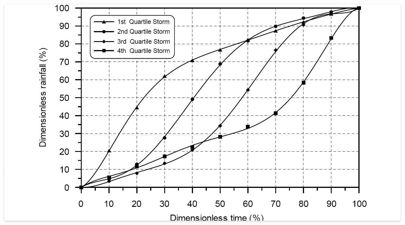 - Huff 방법 적용시 1~4분위 채택에 따라 홍수량의 차이가 매우 크게 발생하는데, 홍수량 산정의 안전성과 극단배제 등을 고려하여 3분위를 채택하는 것이 권장된다.