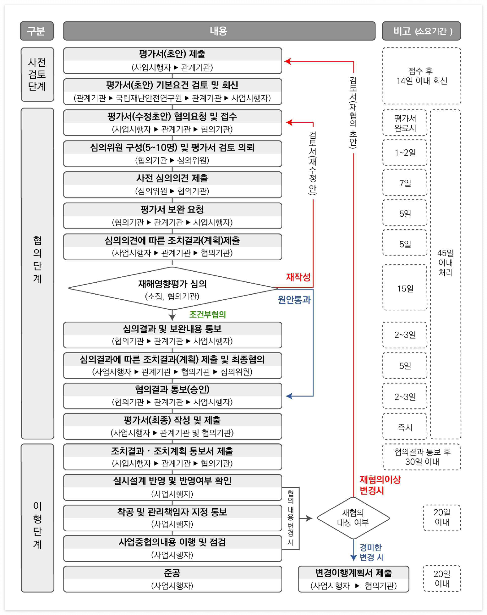 - 재해영향평가 45일, 소규모 재해영향평가 30일, 부득이한 사유가 있으면 협의기간을 10일 범위에서 연장할 수 있습니다.(공휴일 제외)
