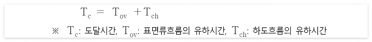 - 유역최원점에서 유역출구점인 하도종점까지 유수가 흘러가는 전체 시간인 도달시간(time of concentration)은 유역최원점에서 하도시점까지의 표면류흐름의 유하시간(overland flow travel time)과 하도시점에서 하도종점까지의 하도흐름의 유하시간(channel flow travel time)의 합으로 구성되므로 다음과 같이 표현된다.