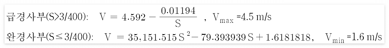 - 연속형 Kraven 공식은 유속을 토대로 하는 도달시간 공식이지만 확인 차원에서 유속을 산정하고 적정성을 검토하여야 한다.