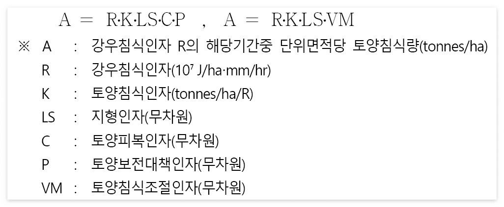 - RUSLE 방법은 다음과 같은 공식을 적용하여 체적단위 토사유출량이 아닌 중량단위 토양침식량을 산정한다. 한편, 공식의 적용시 토양피복인자(C)와 토양보존대책인자(P)의 곱을 미국교통연구단(TRB)에서 제안한 토양침식조절인자(VM)로 대체할 수 있다.
