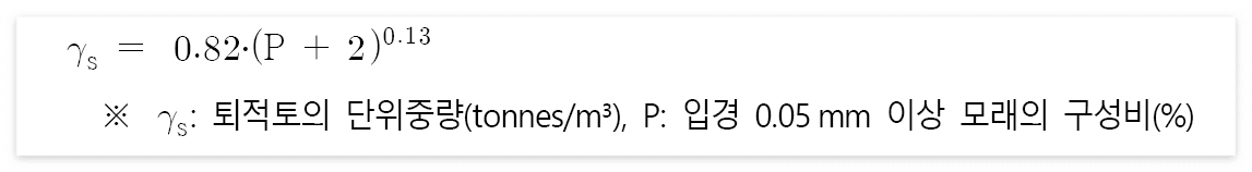 - 중량단위의 토사유출량은 체적단위의 토사유출량으로 환산하기 위하여 필요한 퇴적토의 단위중량을 다음과 같은 Lane & Koelzer(1953)의 경험공식을 적용하여 산정한다.