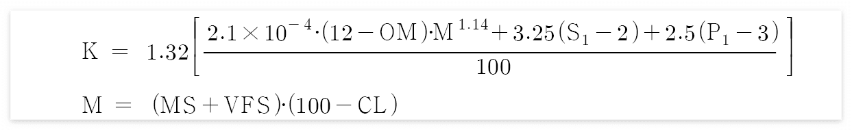 - Wischmeier 방법은 다음과 같은 공식으로 표현되며, 이 공식은 극세사와 실트의 구성비가 70% 이하인 경우에 적용이 가능하다.