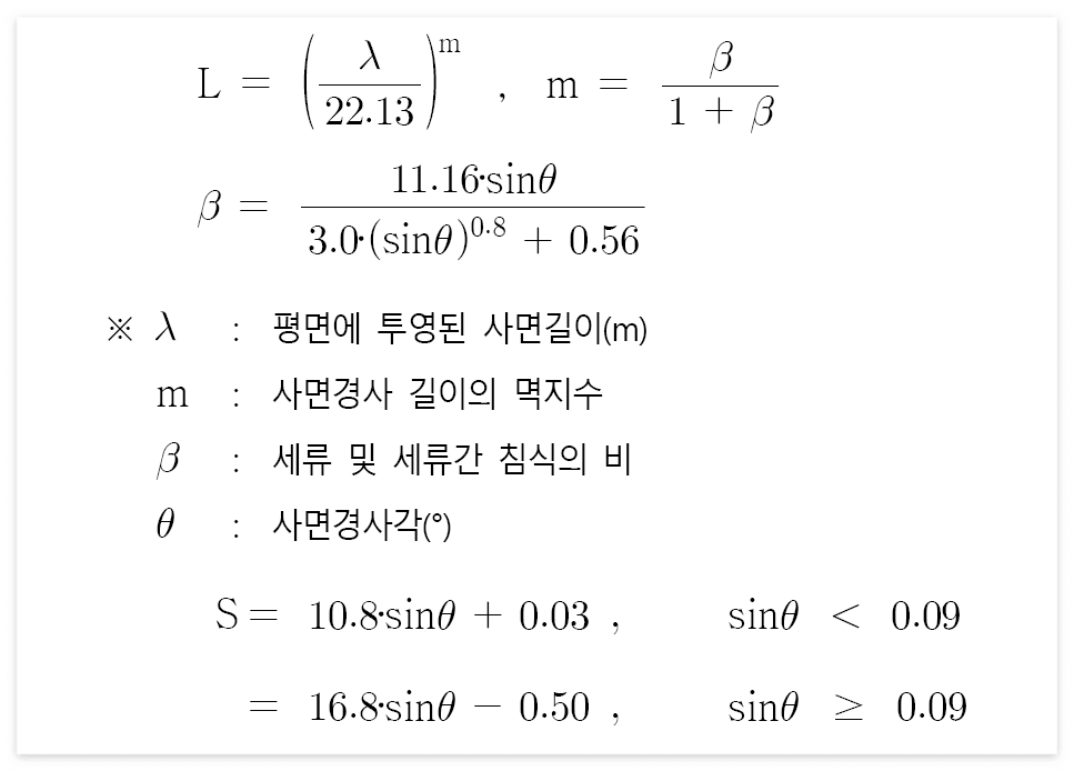 - 무차원 사면길이인자(L)와 무차원 경사인자(S)의 산정방법은 다음과 같다.