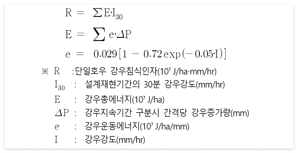 - 단일호우 강우침식인자는 다음과 같은 식을 이용하여 산출한다.