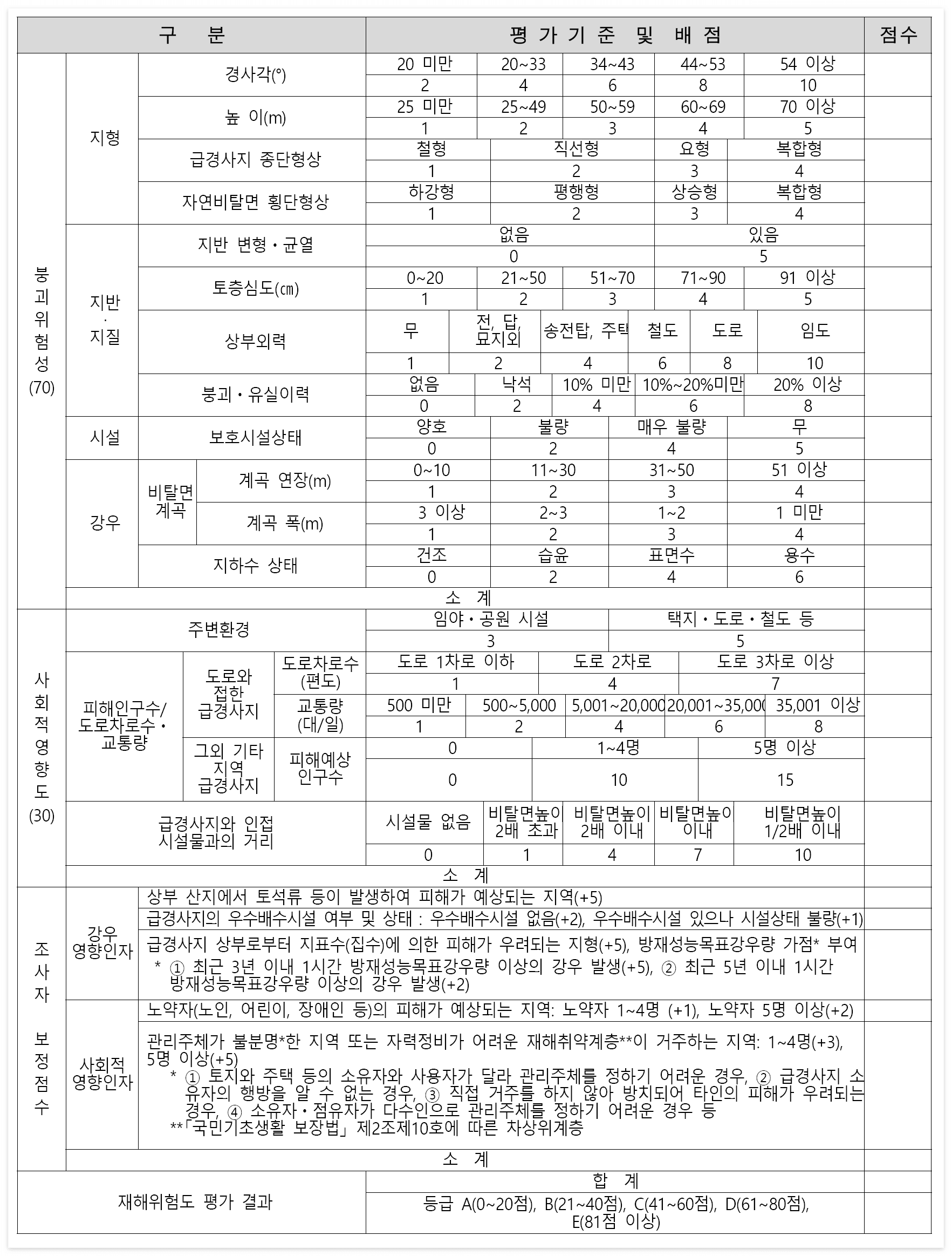 - 재해위험도 평가 시 각 항목의 점수에 대한 근거자료(현장 사진 등)을 제시하여야 한다. 다면, 군부대 등 보안 등의 이유로 근거자료 제시가 어려운 경우에는 그 사유를 명시하여야 한다.