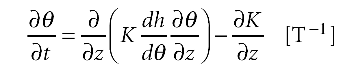 불포화 토양의 경우 플럭스(단위 시간당 단위 면적당 이동하는 물의 양) 방정식은 수분함량 함수인 Darcy의 법칙과 관련이 있습니다. 이 관계를 질량 보존의 방정식과 결합하면 다음과 같은 관계가 도출됩니다.