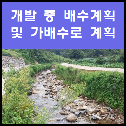 - 개발 중 배수계획은 개발로 인하여 기존 배수체계가 변경되고, 발생되는 토사를 침사지겸 저류지로 유도하여야 하므로 가배수로와 침사지겸 저류지 등으로 구성된다.