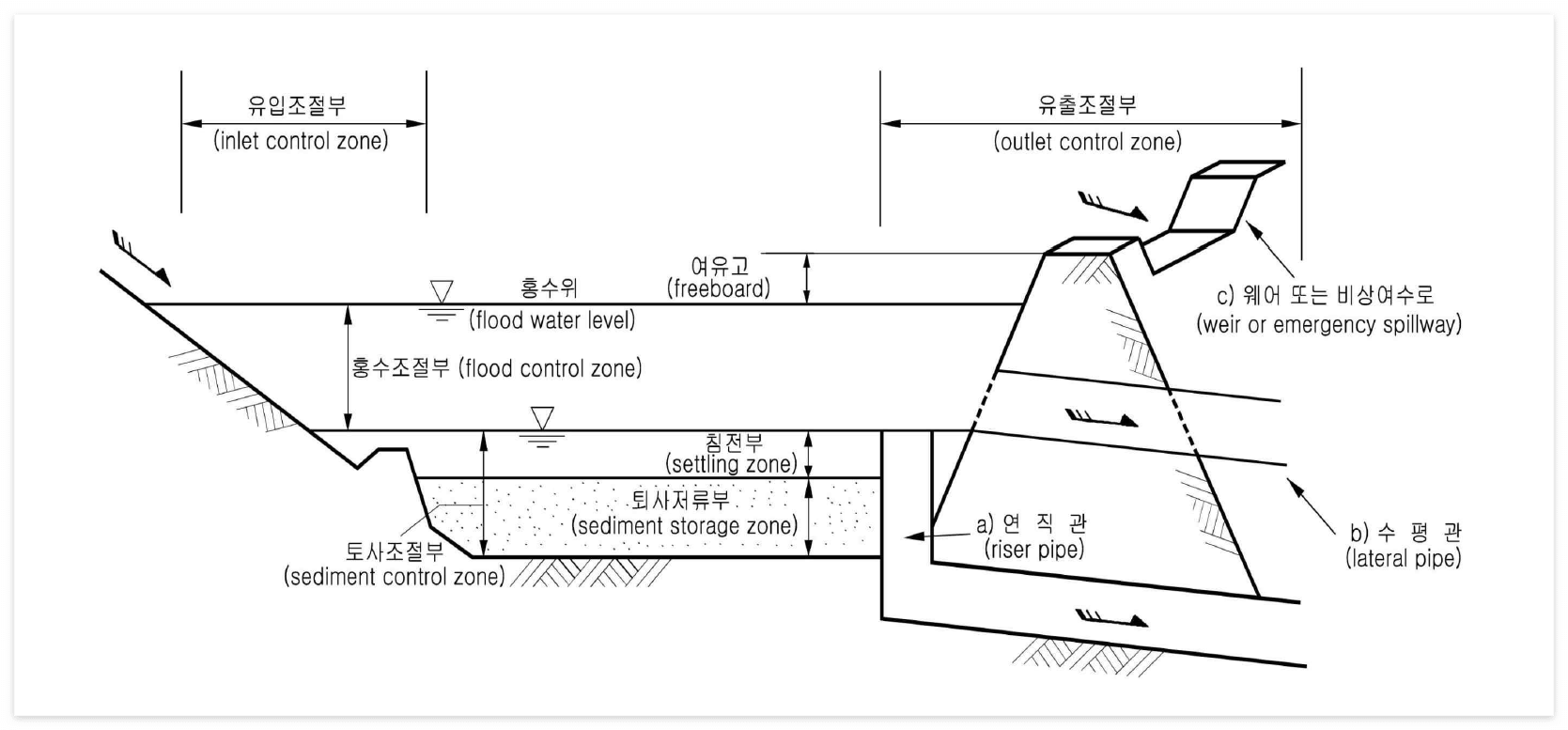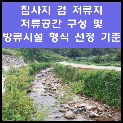 - 개발 중 침사지겸 저류지는 침사지와 저류지의 역할을 병행하므로 토사조절부와 홍수조절부로 구성되며, 일반적인 침사지겸 저류지의 구성은 다음과 같다.
