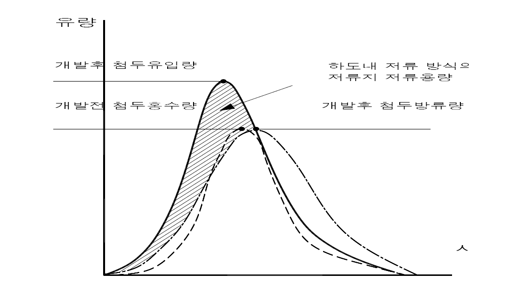 - 반면, 하도외 저류(off-line) 방식은 하천노선의 측면 외부에 저류지를 설치하여 개발 후 홍수량이 개발 전 홍수량 이하인 경우에는 그대로 유하시키고 개발 전 첨두홍수량을 초과하는 경우에는 초과분을 횡월류웨어를 통하여 저류지로 유입시킨 후 하류부 하천의 홍수위가 저하된 다음 방류하는 방식이다.