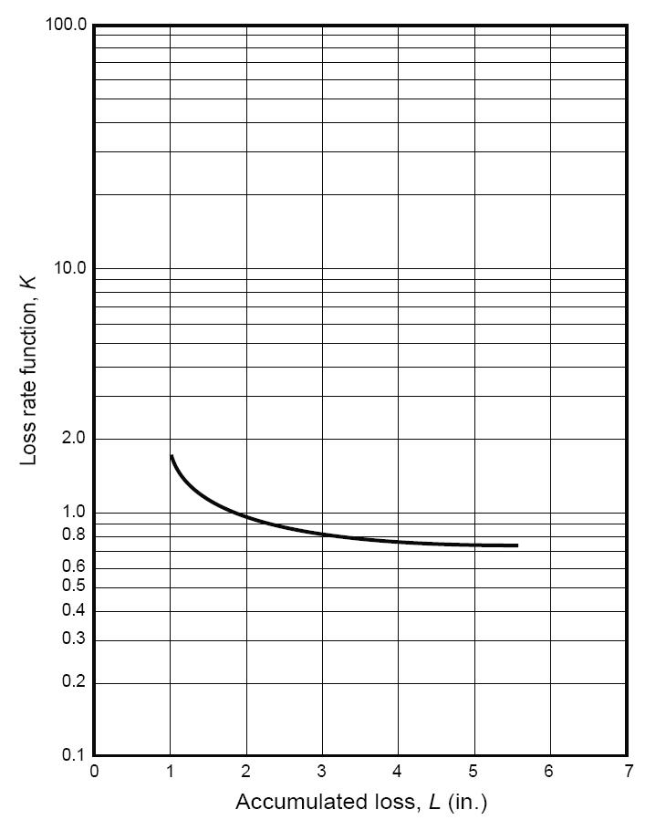 위의 그래프는 손실률 함수에 대한 일반적인 형태입니다. 손실률 계수는 강우량 및 유출량 데이터에서 결정됩니다.