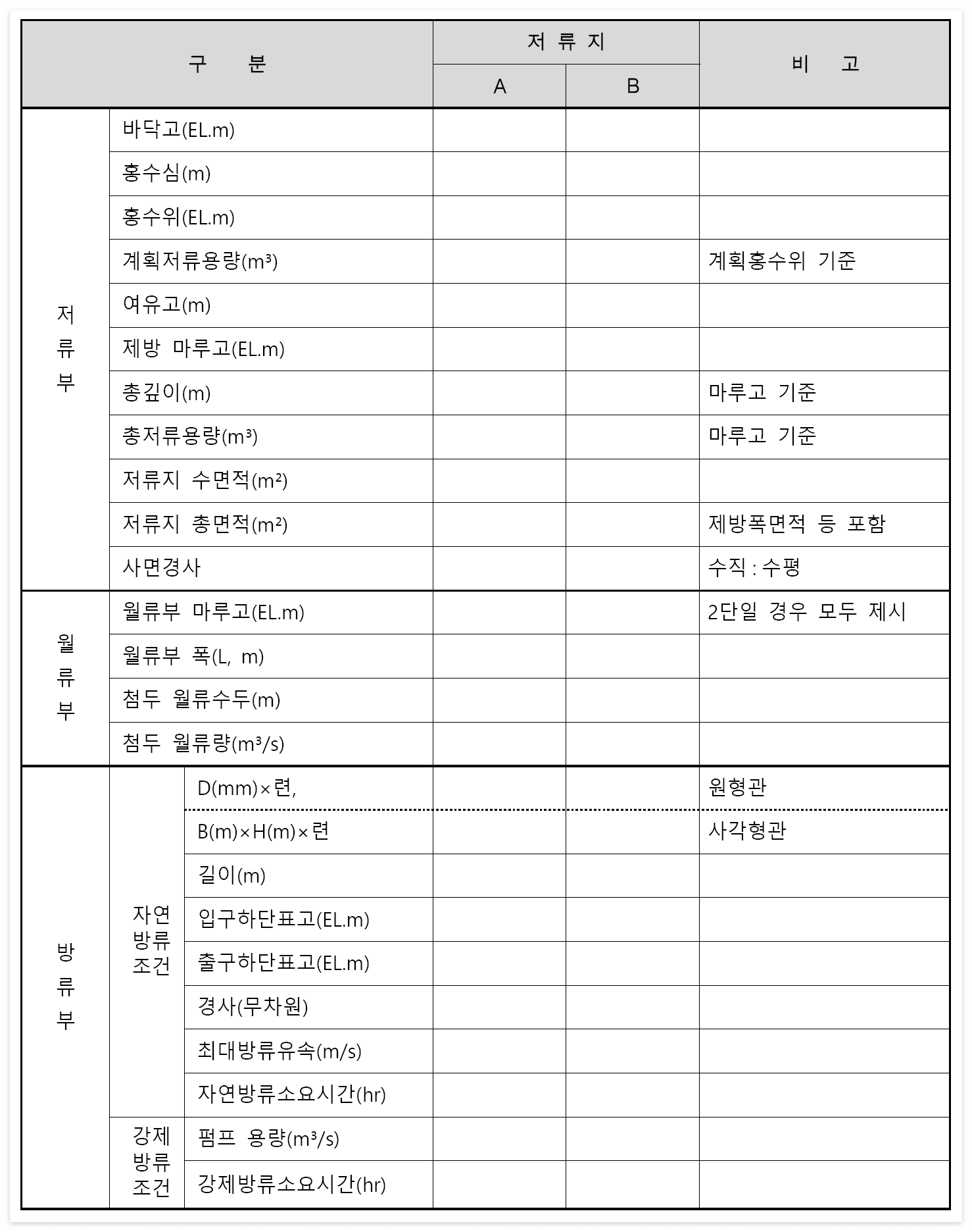 - 최종 결정된 제원을 일목요연하게 아래와 같이 표로 제시하고 제원 내용을 적정성을 검토하여야 하며, 관련 도면들을 제시하여야 한다.