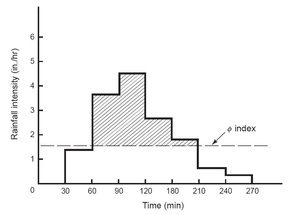 - 강우 깊이가 유역의 지표 유출 깊이와 같도록 강우 강도 다이어그램을 나누는 강도의 수평선을 나타내는 Φ지수