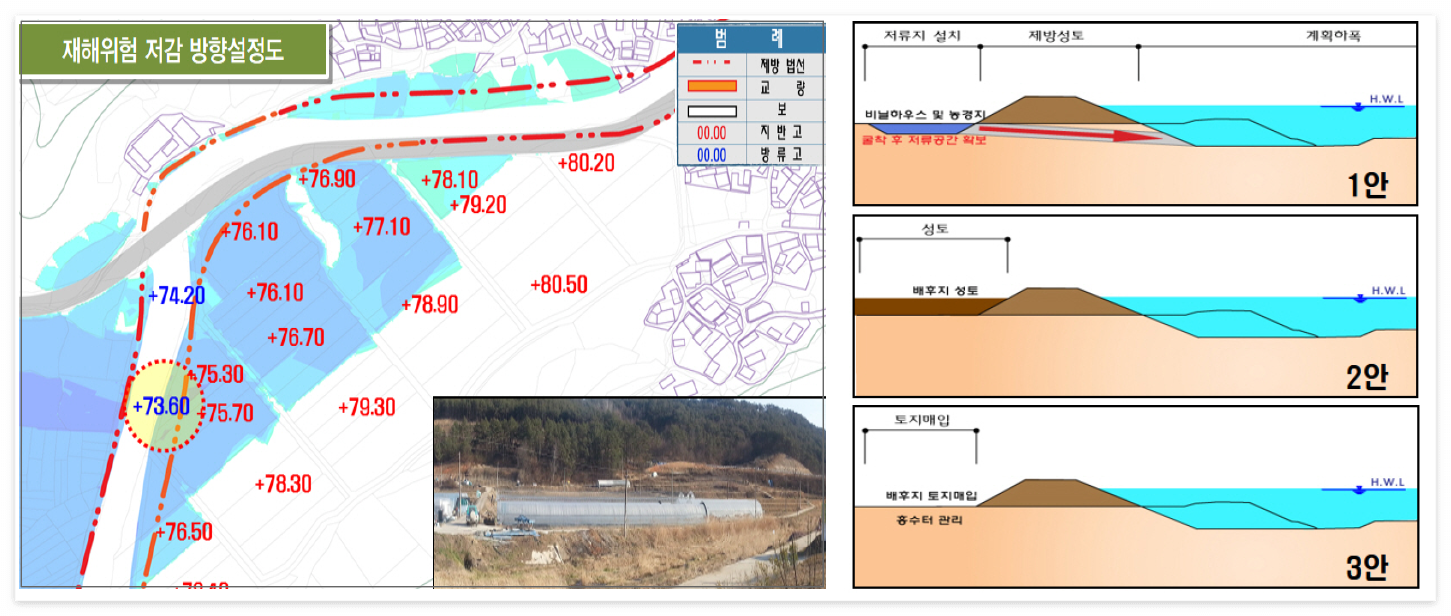 추가대책 수립 | - 1안(펌프설치), 2안(저지대 성토), 3안(배수지 매입) |