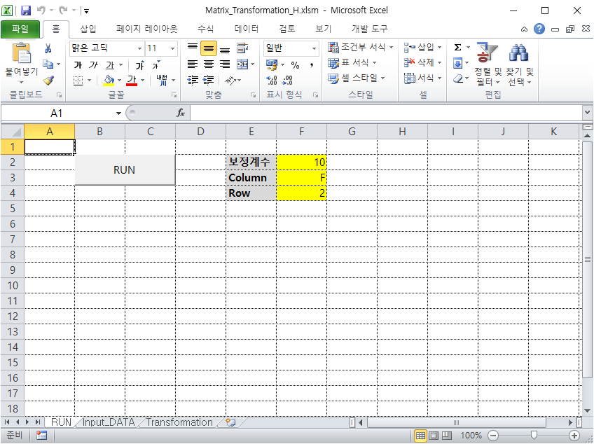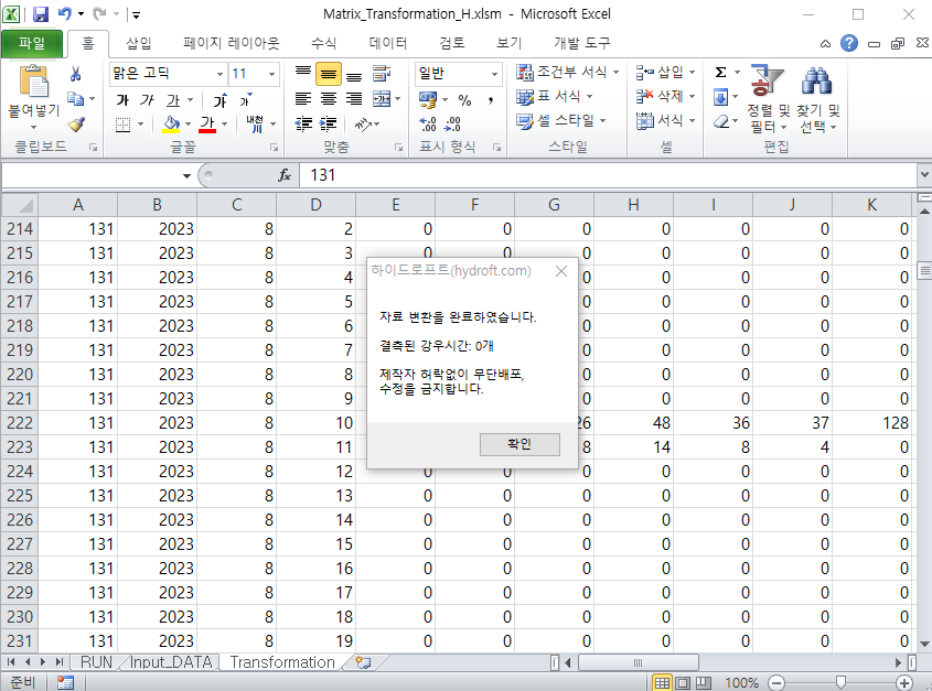 - 다운받은 강우데이터를 Matrix_Transformatio의 Input_DATA 시트에 붙여넣기를 하고 RUN 시트에서 RUN 버튼을 클릭하면 Transformation 시트에 고정시간-임의시간 산정 프로그램에서 적용할 수 있는 형식으로 변환됨