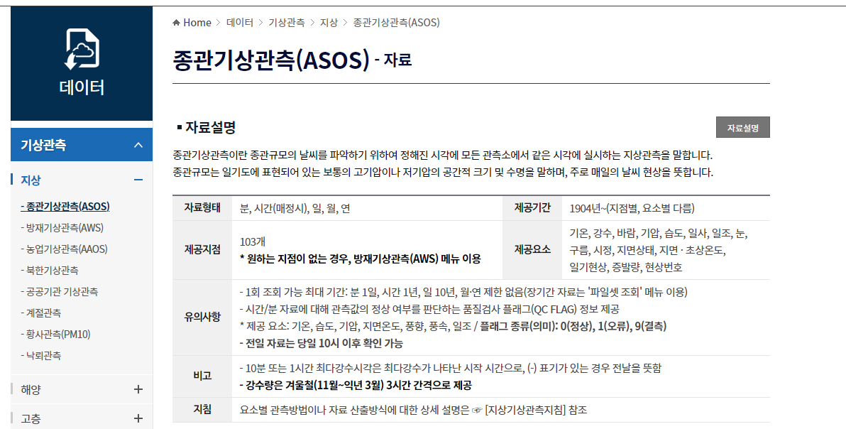 - 상단메뉴중 데이터 ▶ 기상관측 클릭