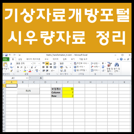 - 다운받은 강우데이터를 Matrix_Transformatio의 Input_DATA 시트에 붙여넣기를 하고 RUN 시트에서 RUN 버튼을 클릭하면 Transformation 시트에 고정시간-임의시간 산정 프로그램에서 적용할 수 있는 형식으로 변환됨