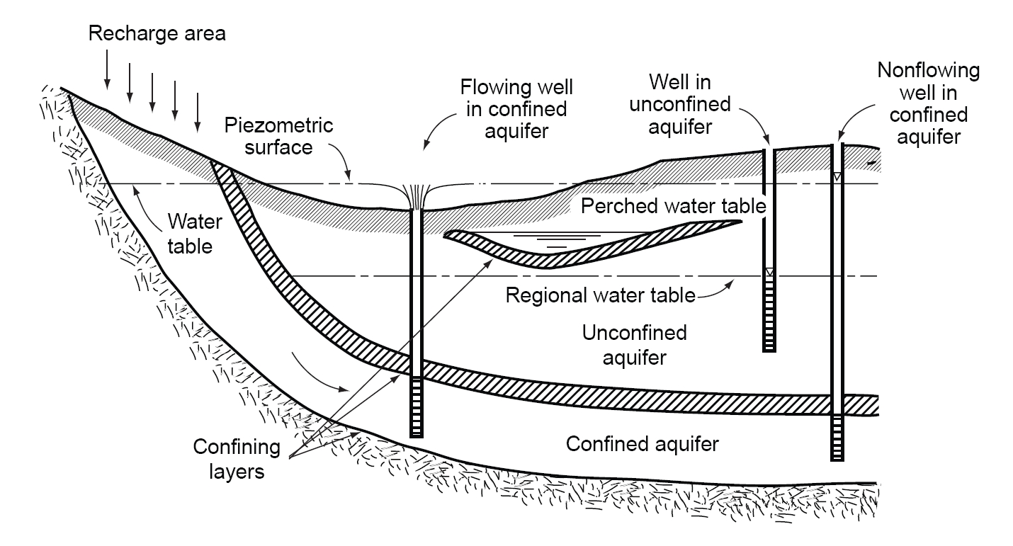 상당한 양의 물을 생산할 수 있는 지층을 대수층이라고 합니다. 대수층은 물이 이동할 수 있는 구멍이나 기공이 서로 연결되어 있습니다. 충적층은 대수층의 가장 좋은 형태이며, 대부분의 개발 대수층이 이러한 지층에 분포하고 있습니다. 대수층은 하천과 지표면에서 스며들어 직접 물을 보충할 수 있다는 장접이 있습니다. 화산성 암석, 석회암 및 사암은 균열, 구멍, 단층 동굴 등을 통해 물을 생성합니다.