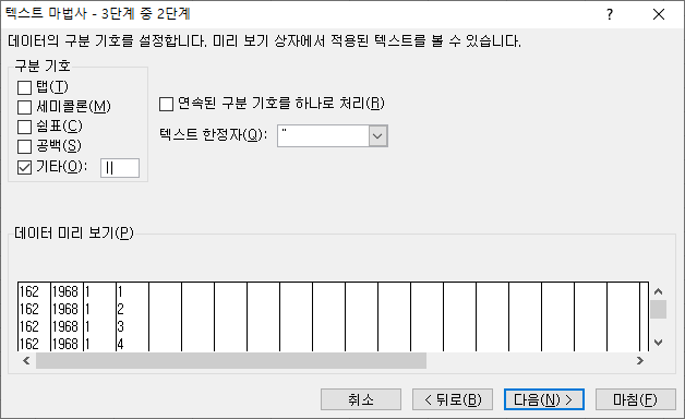 - 데이터 구분기호 설정에서 기타를 체크하고 구분기호 「|」를 입력 후 「다음(N)>」 버튼을 클릭