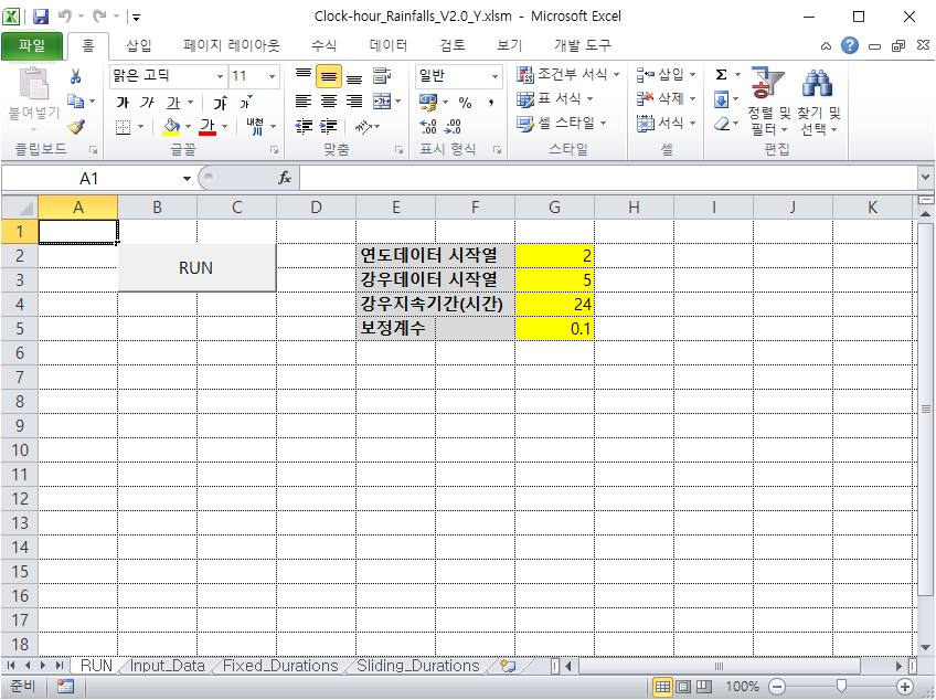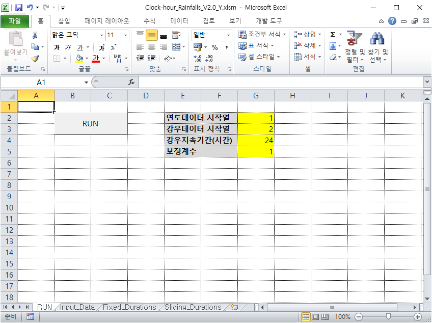 - 프로그램의 실행은 RUN 시트의 RUN버튼을 클릭하면 되며, 시우량 자료 데이터별 입력값이 시우량 데이터의 종류별로 다른 점을 확인 한 후 버튼을 클릭하기 바람