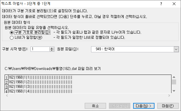 | 1단계 : 구분기호로 분리 | 2단계 : 구분기호 설정 | 3단계 : 데이터 서식지정 |