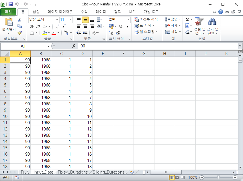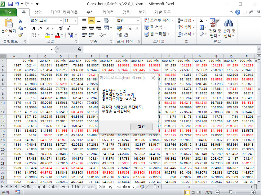 - RUN 버튼을 클릭하면 데이터 분석을 실시하며 「Fixed_Durations」시트에 고정시간 강우량 「Sliding_Durations」시트에 임의시간 강우량이 출력됨