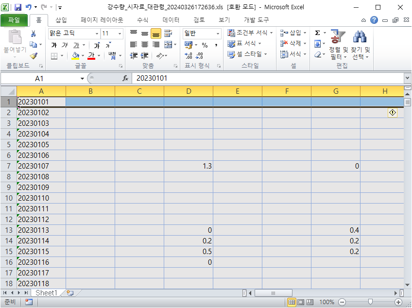 - A열에 연도와 월, 일이 YYYYMMDD 형식으로 한꺼번에 나타나며 B열부터 시우량자료가 입력되어 있음