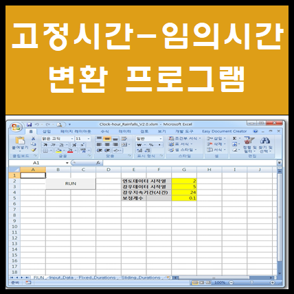 - 노란색 셀에 값을 입력하고 Input_Data 시트에 강우데이터를 붙여넣기 한 후에 RUN 버튼을 클릭하면 고정시간 및 임의시간 강우량 결과값을 각 시트에 출력하게 됨