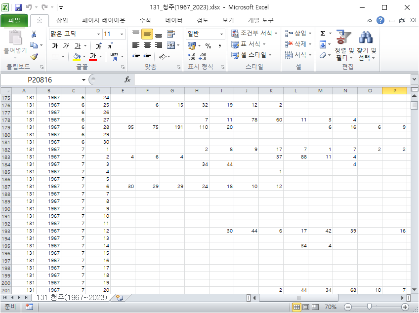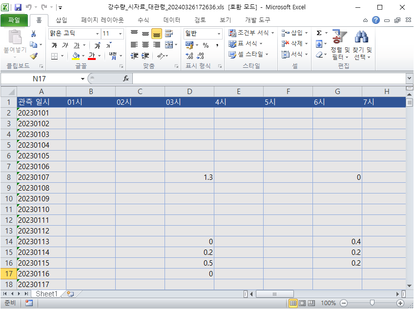 - A열에 연도와 월, 일이 YYYYMMDD 형식으로 한꺼번에 나타나며 B열부터 시우량자료가 입력되어 있음