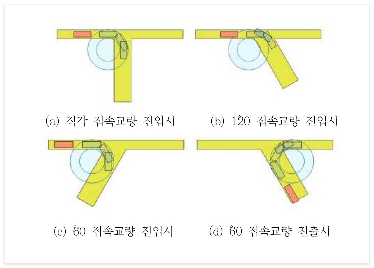 - 차량의 진·출입이 원활하도록 가각부를 설치(연결도로와 접속되는 교량의 접속각을 고려하여 회전반경 7.0m 이상 확보)