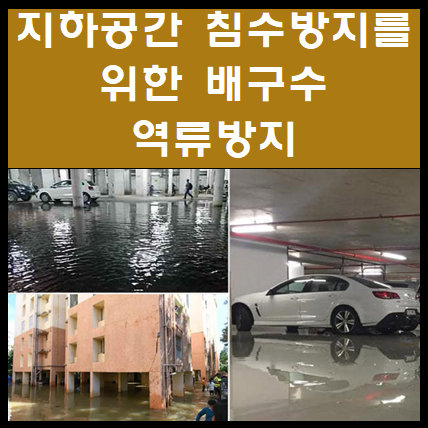 - 출입구를 통한 직접적인 물의 유입이 없더라도 배수구를 통한 역류현상으로 인해 지하공간이 침수되는 경우가 있다. 하천의 범람이나 호우로 인한 지하층이 침수됨으로써 배수구의 위치보다 수위가 올라갈 경우 배수관을 통하여 지하공간으로 물이 유입할 수 있다. 아무리 출입구에 철저한 침수대책을 하여도 이러한 경우에는 내부로부터의 침수를 막기가 어렵다. 따라서 지하공간의 배수구 및 배수관에는 역압이나 역사이펀 작용으로 인한 역류의 방지 대책으로 역류방지밸브(Back flow Preventer)등을 설치하여야 한다.