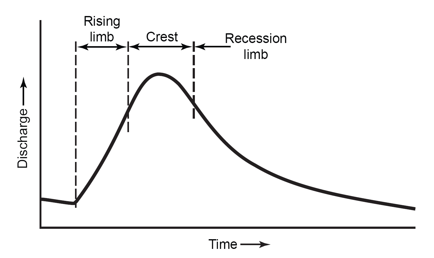 유역의 특성과 강우 지속 기간, 강우강도 및 균일성에 따라 모양이 특징적인 상승 지점이 있습니다. 상승 구간은 상승 지점의 변곡점에서 하강 지점의 변곡점까지 수문곡선의 일부를 포함합니다. 여기에는 최고 유량이 포함됩니다. 최고 지점은 유역의 모든 부분에서 배출구에 유량이 도착한 것을 나타냅니다. 전체 지역에 영향을 미칠 만큼 충분히 오래 지속되지 않는 단기간 강우의 경우, 첨두 유량은 가장 높은 집중도의 유출수를 받는 유역의 해당 부분으로부터의 흐름을 나타냅니다.