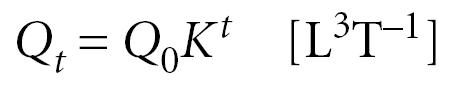 변곡점으로 알려진 첨두 구간 끝은 지표흐름(초과 강우)에서 하천 배출구로 직접 유출되는 것이 중단되는 시점을 나타냅니다. 따라서 함몰 지역의 저류 저장, 중간 흐름 및 지하수 흐름의 저장 기여도를 나타냅니다. 감수곡선(하강곡선)은 강우의 특성과 무관합니다. 이는 배수 과정으로 인한 방류율로 간주할 수 있습니다. 추가 유입이 없는 경우, 배수 처리 과정으로 인한 방류의 시간변화, 즉 감수곡선의 방정식은 다음과 같이 나타낼 수 있습니다.