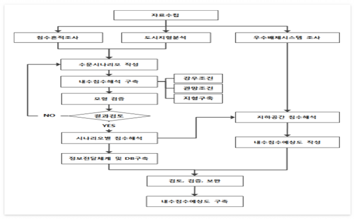 ① 과거 내수 침수자료 및 침수 당시 방재시설 현황 조사 → ② 강우 및 수문분석 시나리오 구축 → ③ 도시지역 지형자료 구축 → ④ 도시지역 우수배제시스템 자료 구축 →⑤ 내수침수 해석 모형의 구축 →⑥ 모형 검증 및 시나리오별 수치계산 → ⑦ 내수침수 결과의 해석 및 정리 → ⑧ 각종시설의 위치 및 정보전달 계통의 정리 → ⑨ 내수침수예상도 작성