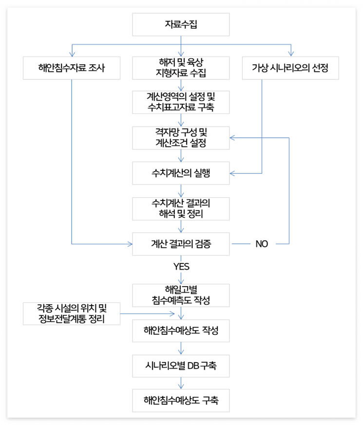 ① 해안침수자료 조사 → ② 가상 시나리오 작성 → ③ 해저지형 및 육상지형 자료 수집 → ④ 계산영역설정 및 수치표고자료 구축 → ⑤ 격자망 구성 및 계산조건 설정 → ⑥ 모형 검증 및 시나리오별 수치계산 → ⑦ 수치계산 결과의 해석 및 정리 → ⑧ 시나리오별 계산 결과의 검증 → ⑨ 시나리오별 해안침수예상도 작성 → ⑩ 각종 시설의 위치 및 정보전달 계통의 반영 → ⓐ 침수예상도의 작성 → ⓑ 시나리오별 DB구축