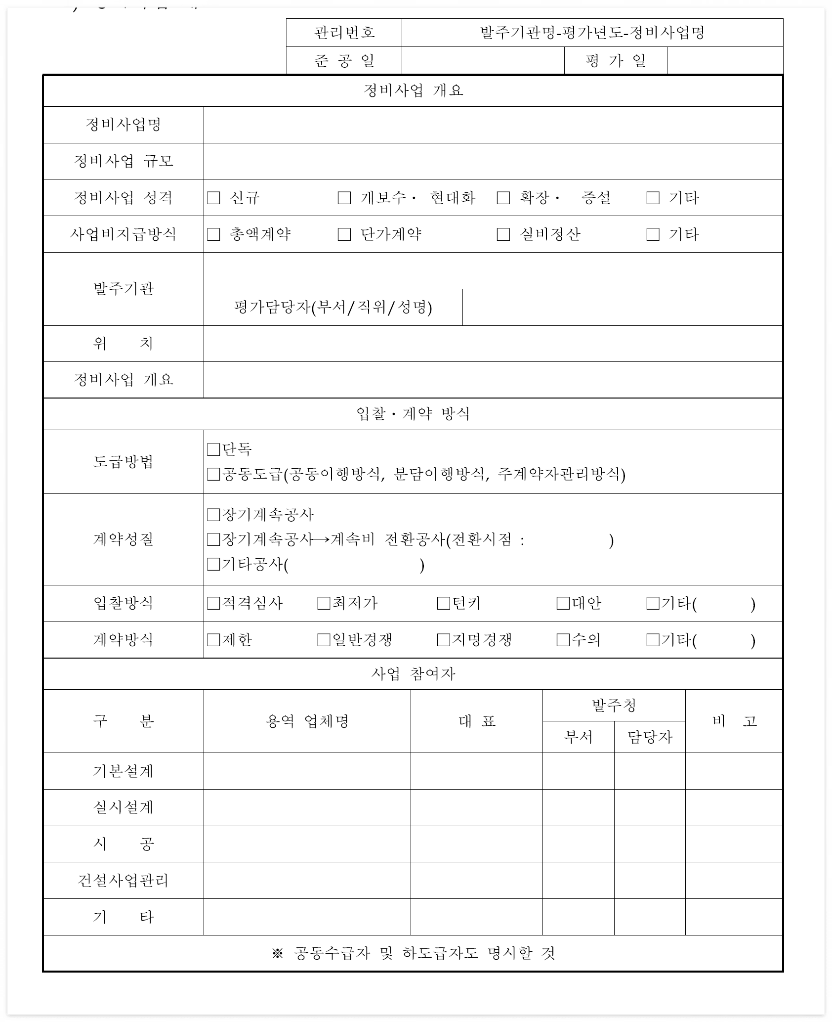 | ※ 시공란의 '계약공기'에는 계약서상의 최초 착공일과 계약상의 준공일을 기재하고, '실제공기'는 계약상의 최초 착공일과 실제 정비사업 준공일을 기재 | ||||