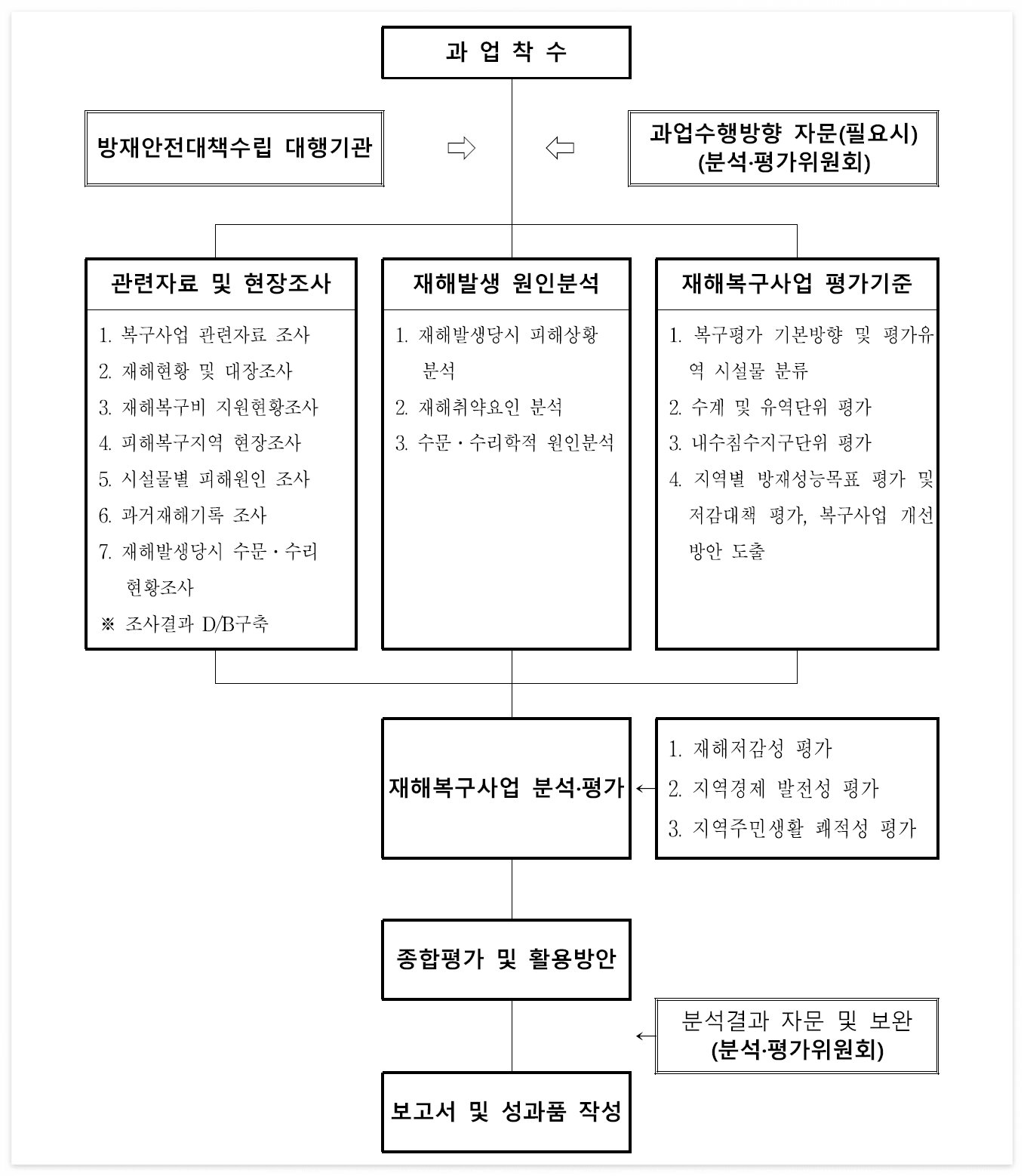• 분석·평가의 효율적인 과업수행을 위하여 방재안전대책수립 대행기관의 기술자 및 학술부문(필요시)의 전문가가 수행하는 것을 원칙으로 한다.